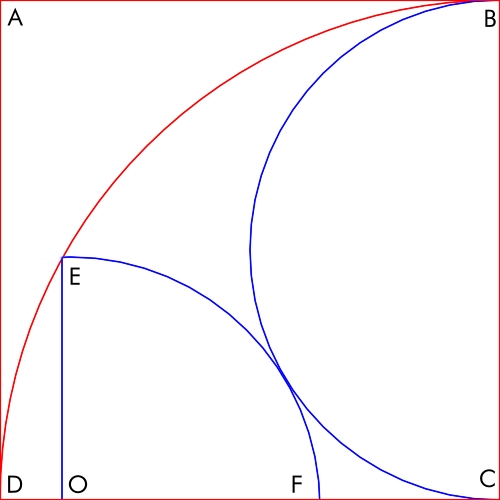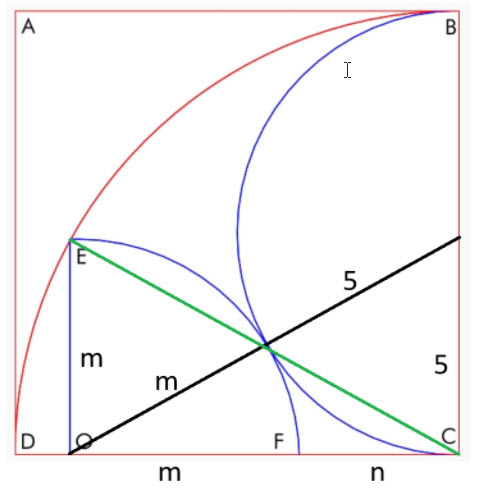 ABCD on neliö, jonka sivun pituus on 10. Sen sisään on piirretty puoliympyrä ja neljännesympyrä, kuten seuraavassa kuvassa on esitetty.