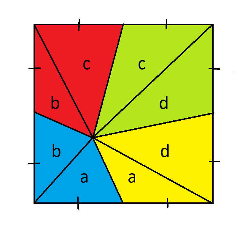 Muista, että kolmion pinta-ala on pohja * korkeus / 2. Koska kaikilla kolmioilla on sama pohja, voimme yhdistää samankorkuiset kolmiot samanpinta-alaisiksi.