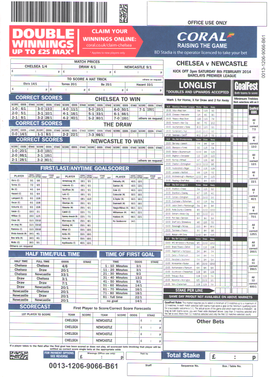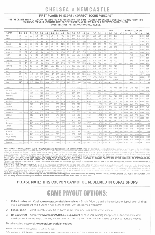 Tässä on vedonlyöntilomake Chelsea/Newcastle-ottelusta, jonka poimin mukaani stadionilta. Klikkaa kuvaa nähdäksesi sen suurempana. Analysoin joitakin vetoja. Jos oletan minkä tahansa tyyppiselle vedolle, että kaikille tuloksille on sama odotettu tuotto, se näyttäisi seuraavalta.