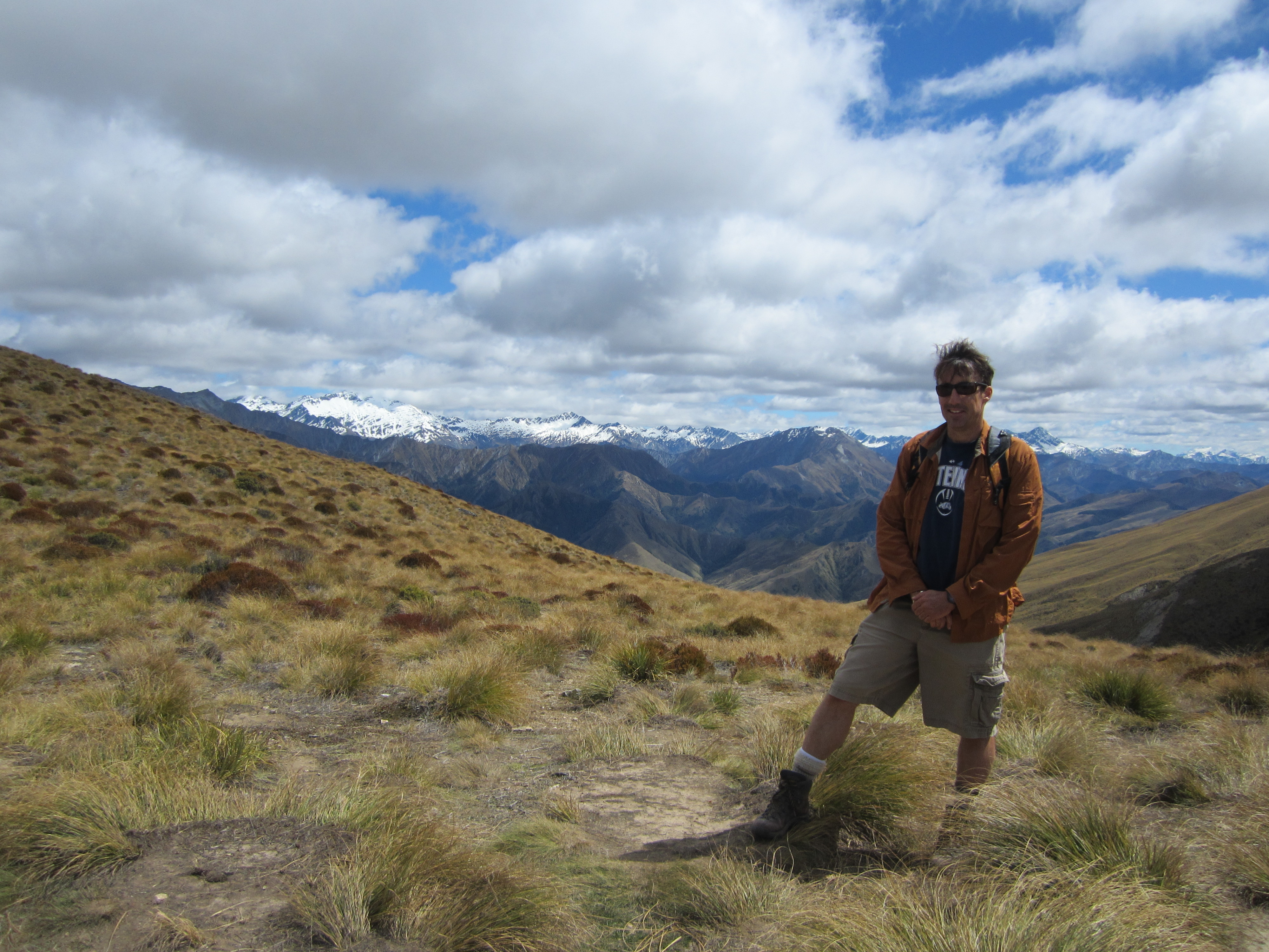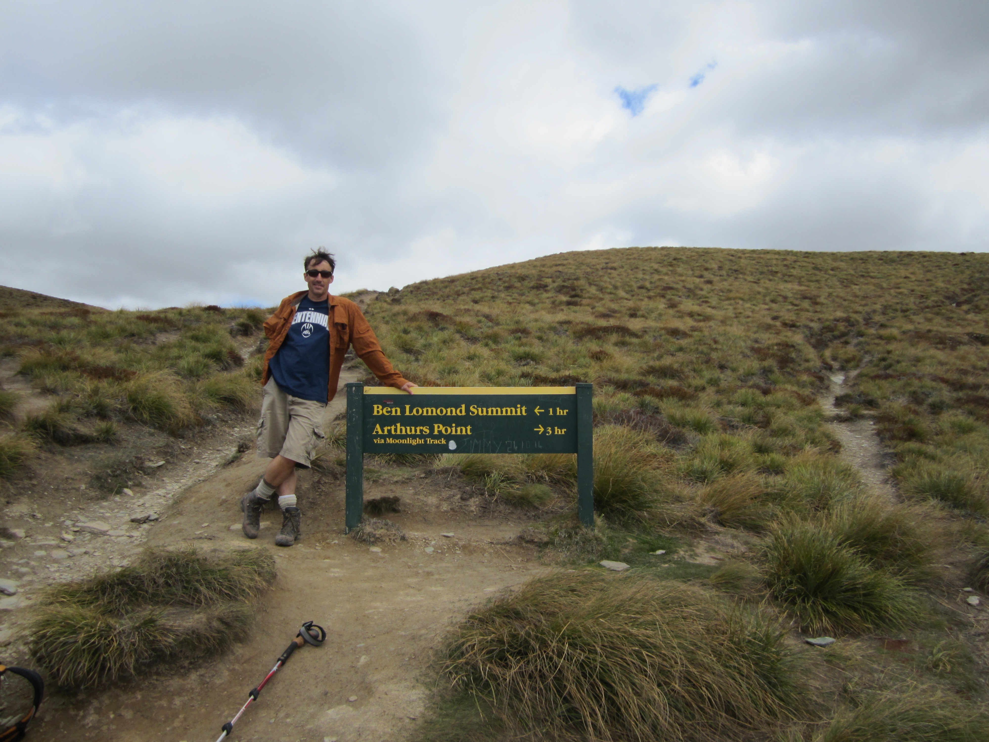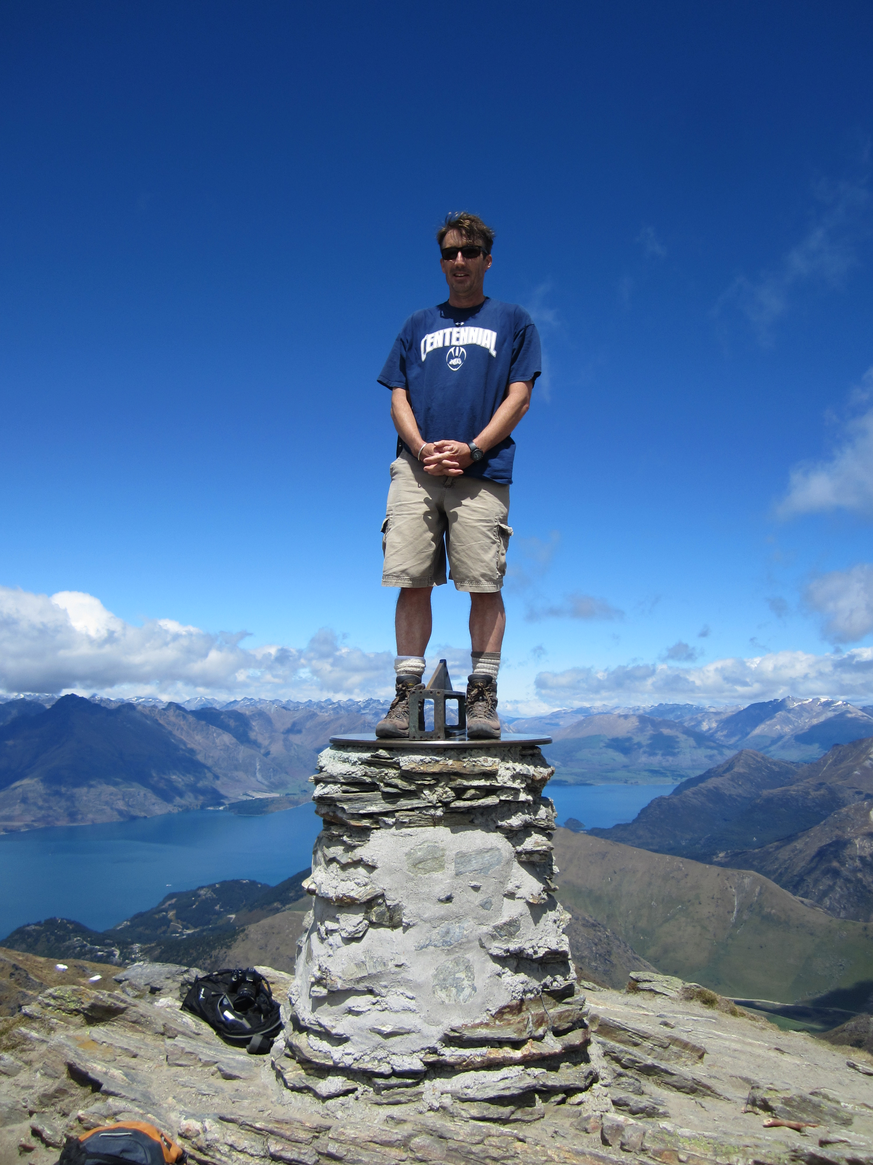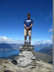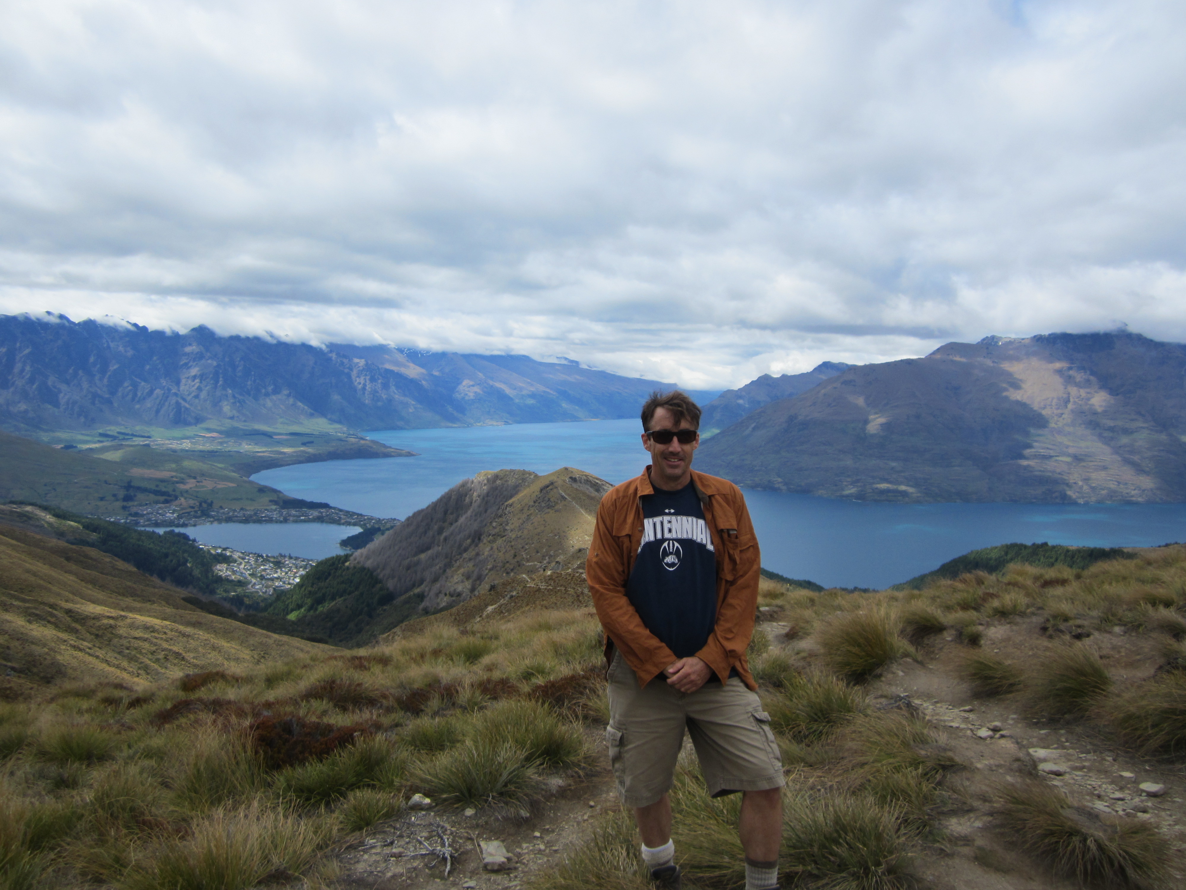 Queenstownin ympäristössä on kilometreittäin patikointi- ja pyöräilyreittejä. Tässä minä olen yhdellä niistä, näköalalla Wakatipu-järvelle. Lonely Planetin mukaan tämä on maailman toiseksi puhtain järvivesi, ja se on puhtaampaa kuin pullotettu vesi.