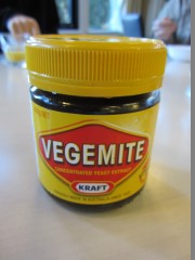 Kuulin Vegemitesta ensimmäisen kerran Men at Workin kappaleesta Down Under 1980-luvulla, mutta en tiennyt sen olevan oikeaa, aivan kuten Acme Companyn, ennen kuin näin sitä pöydällä jokaisessa majatalossani. Ehkä se on opittu maku, mutta pohjoisen pallonpuoliskon mielestäni tämä tavara on kamalaa! Luulen, että se sopisi paremmin saappaideni pohjien korjaamiseen. Tämä pätee myös Marmiteen.