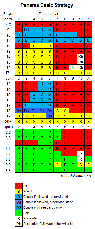 Näiden sääntöjen mukaan talon etu on erittäin pieni, 0,12 % jatkuvalla korttien sekoittajalla tai 0,14 % ilman. Tässä artikkelissa käsitellään Panaman sääntöjen mukaista perusstrategiaa. Seuraavassa on Panaman sääntöjen mukainen perusstrategia.