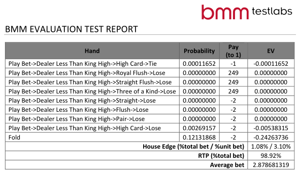 Seuraavat ovat kuvakaappauksia BMM:n matemaattisesta raportista, jotka näyttävät kaikkien mahdollisten tapahtumien todennäköisyyden ja vaikutuksen palautukseen 3 Card Monsterin voittotaulukossa 1.