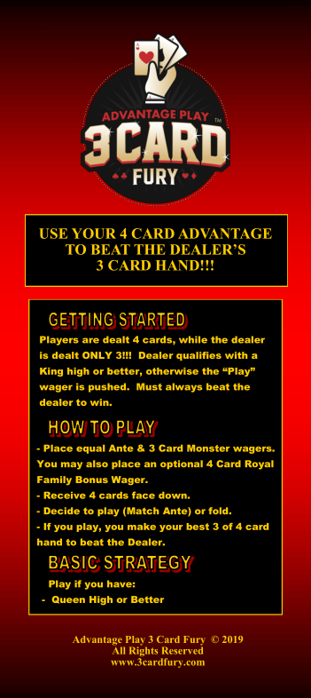 3 Card Fury aloitti kenttäkokeilunsa Green Valley Ranchilla Las Vegasissa kesäkuussa 2019. Peli noudattaa samaa pisteytystä kuin Three Card Poker ja samanlaista panostusrakennetta kuin Ultimate Texas Hold 'Em, jossa on kaksi pakollista panosta ja mahdollisuus korottaa tai luovuttaa.
