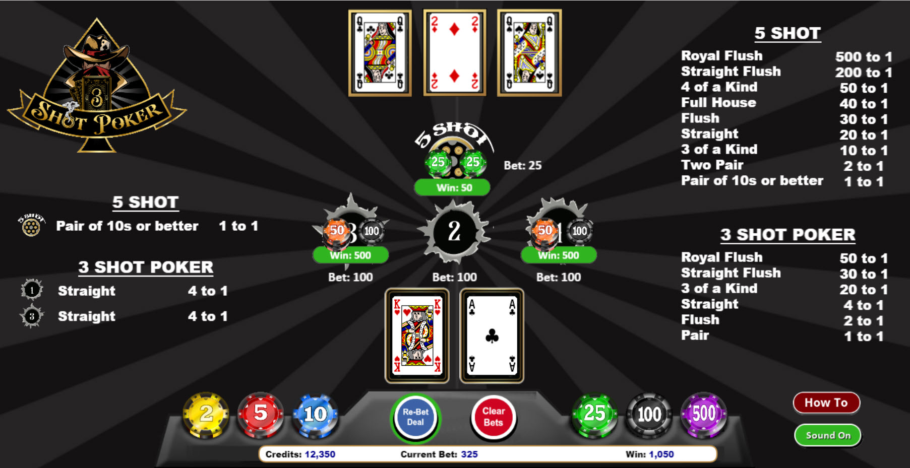 3 Shot Poker on Casino Gaming Developmentin kehittämä pokerimuunnelma. Sen kokeilu alkoi Grand Sierra Resortissa Renossa 3. maaliskuuta 2023. Lyhyesti sanottuna peli noudattaa perinteistä korotus- tai luovutusformaattia, jossa lopulliset kortit paljastetaan päätöksen tekemisen jälkeen.