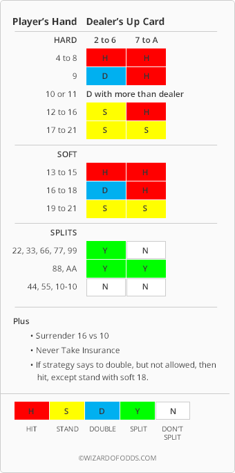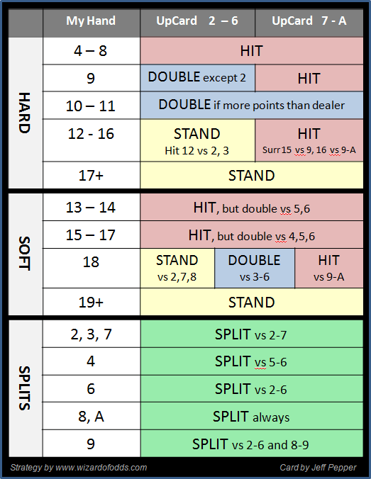 Lukijani nimeltä Jeff antoi toisen taulukon yksinkertaisesta strategiastani, poikkeuksin pienellä präntättyinä. Yksityiskohtia velhon yksinkertaisesta strategiasta löytyy Blackjack-liitteestäni 21 .