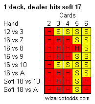 Tämä liite näyttää kokoonpanosta riippuvan strategian, kun käytetään yhtä pakkaa ja jakaja jää pehmeälle 17:lle. Sikäli kuin tiedän, maailmassa ei ole yhtään kivijalkakasinoa, joilla on nämä säännöt. Aikoinaan, kun loin tämän sivun, tällaisia sääntöjä saattoi löytää joiltakin nettikasinoilta.