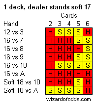Jos yllä olevat taulukot ovat liian informatiivisia, voit saada lähes saman tehokkuuden alla olevista taulukoista ja listoista, jotka näyttävät tilanteita, joissa oikea pelitapa riippuu pelaajan kädessä olevien korttien määrästä. Tämäkin perustuu yhden pakan peliin, jossa jakaja jää pehmeällä 17:llä.