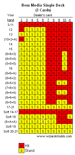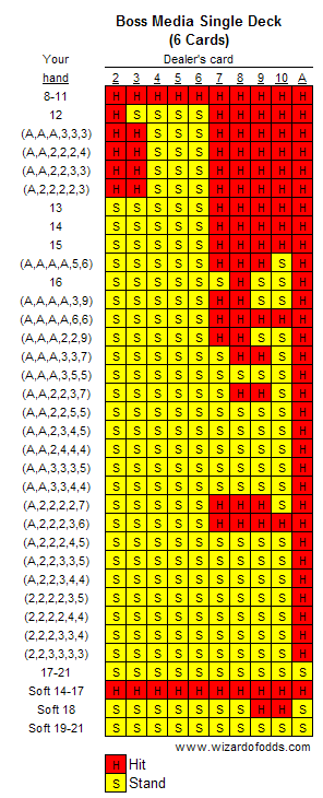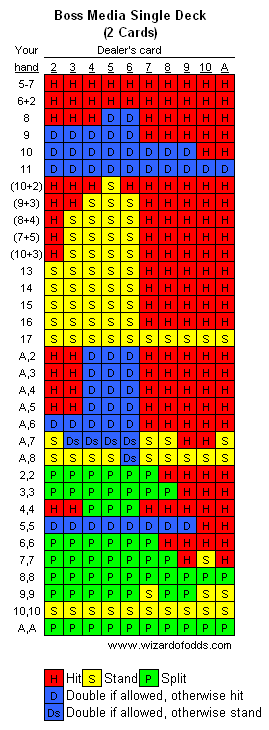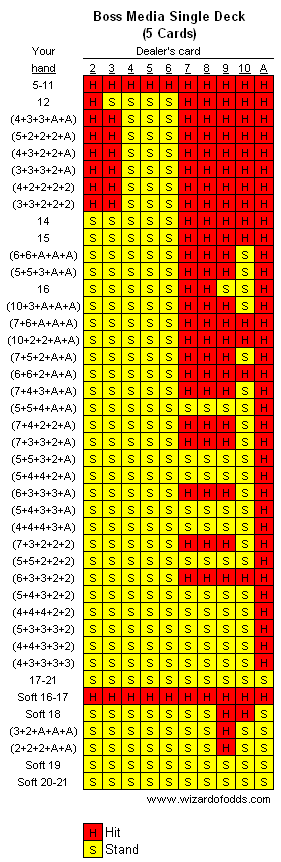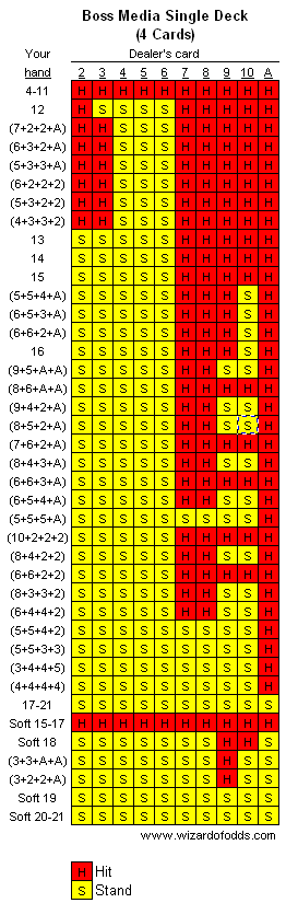 Seuraavat taulukot sopivat Boss Median sääntöihin. Niitä voidaan käyttää myös Microgamingin sääntöjen mukaisesti, paitsi että pelaajan ei tule tuplata 11:llä tai jakaa kaseja 10:tä tai ässää vastaan, koska jakaja ei tarkista blackjackia Microgamingin Classic Blackjackin sääntöjen mukaan. Microgaming ei myöskään salli tuplaamista 8:lla.