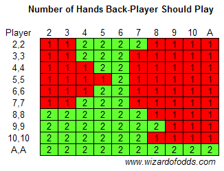 Ensimmäinen alla oleva taulukko näyttää, kuinka monta kättä takapelaajan tulisi valita pelattavaksi. Tämä perustuu äärettömiin pakkoihin ja on sama riippumatta siitä, saako jakaja vai jääkö hän pehmeällä 17:llä. Taulukossa oletetaan, että tuplaaminen jaon jälkeen on sallittua. Se sisältää myös ilmeisen huonot jakamiset, jotka on sisällytetty täydellisyyden vuoksi eikä tarkoittamaan, että kontrolloivan pelaajan pitäisi jakaa. Taulukossa oletetaan myös, että etupelaaja jatkaa jakamista uudelleen, vaikka se olisi huono peli.