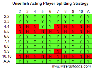 Seuraava taulukko viittaa epäitsekkääseen pelaajaan, joka jakaa tai ei jaa takapelaajan edun mukaan. Näin voi käydä, jos kaksi pelaajaa on salaliitossa ja takapelaajan panos on huomattavasti suurempi kuin toimivan pelaajan panos. Taulukko näyttää, milloin toimivan pelaajan tulisi jakaa, olettaen, että tuplaus jaon jälkeen on sallittu ja että pakkoja on ääretön määrä. Ei ole väliä, saako jakaja vai jääkö hän pehmeällä 17:llä.