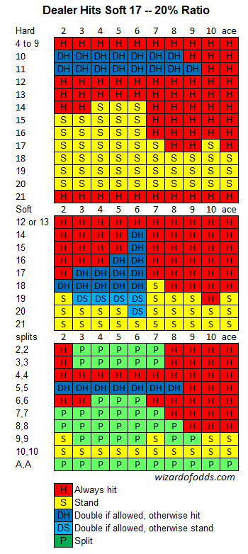 Seuraavassa on strategia, jolla maksimipanos on 21 Magic -pelissä, joka on 20 % blackjack-panoksesta ja jakaja saa pehmeän 17.