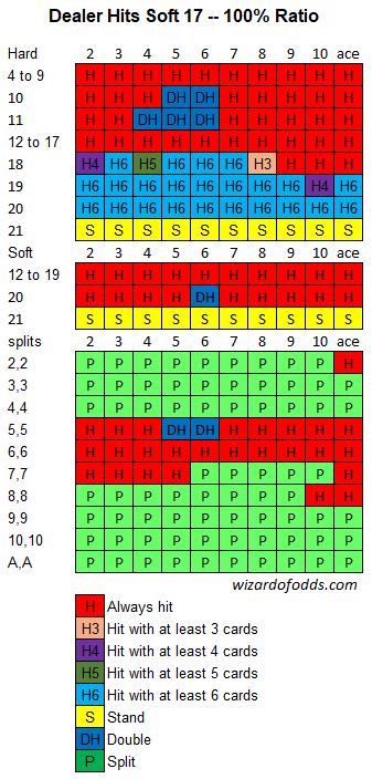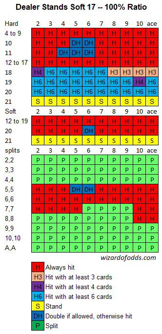 Seuraavassa on strategia, jolla maksimipanos on 21 eli 100 % blackjack-panoksesta ja jakaja saa pehmeän 17.