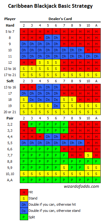 Seuraava taulukko näyttää Caribbean Blackjackin perusstrategian.