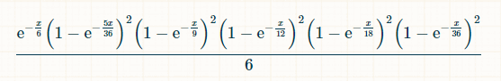 Koska voittava 7 voi tapahtua milloin tahansa, voittotodennäköisyys on tämän todennäköisyyden integraali x:n yli nollasta äärettömyyteen. Ei sillä, että meidän tarvitsisi tietää, mutta integraali on, ennen integroinnin rajojen asettamista, (-6*e^(-x/6)+(72*e^(-(7*x)/36))/7+(9*e^(-(2*x)/9))/2-8*e^(-x/4)-(18*e^(-(5*x)/18))/5-(72*e^(-(11*x)/36))/11+(72*e^(-(13*x)/36))/13+(108*e^(-(7*x)/1 8))/7+(24*e^(-(5*x)/12))/5-(27*e^(-(4*x)/9))/4-(216*e^(-(17*x)/36))/17-10* e^(-x/2)-(72*e^(-(19*x)/36))/19+(27*e^(-(5*x)/9))/5+(144*e^(-(7*x)/12))/7+ (54*e^(-(11*x)/18))/11-(72*e^(-(23*x)/36))/23-(15*e^(-(2*x)/3))/2-(216*e^( -(25*x)/36))/25-(54*e^(-(13*x)/18))/13+(8*e^(-(3*x)/4))/3+(54*e^(-(7*x)/9) )/7+(72*e^(-(29*x)/36))/29-(72*e^(-(31*x)/36))/31-(9*e^(-(8*x)/9))/8-(24*e) ^(-(11*x)/12))/11+(18*e^(-(17*x)/18))/17+(72*e^(-(35*x)/36))/35-e^(-x))/6.