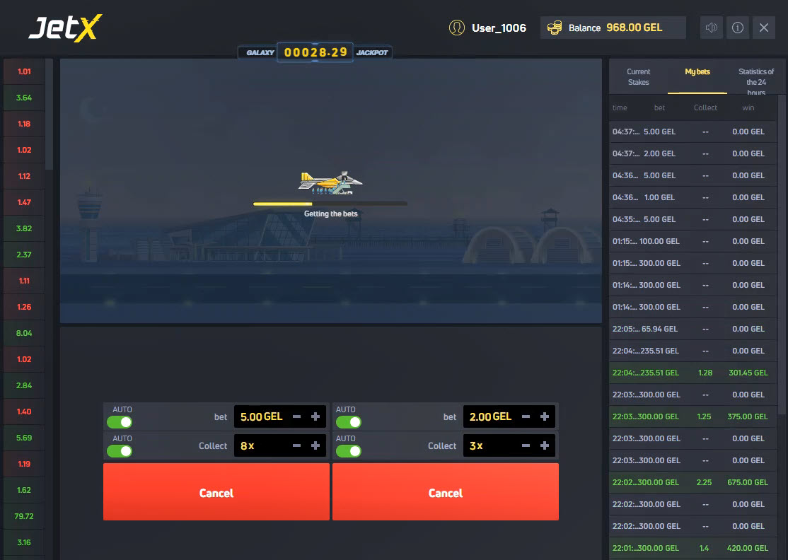 Ennen kuin tein kaksi vetoa, saldoni oli 975 GEL. Minulla ei ole aavistustakaan, mitä GEL on, rehellisesti sanottuna. Peliä pelattiin leikkisästi. Tein kaksi vetoa, kuten yllä olevassa kuvassa näkyy. Ensimmäinen veto vasemmassa alakulmassa olevassa laatikossa on 5 ja sen voittotavoite on 8x panokseni, mikä on 40. Toinen veto oikeassa alakulmassa olevassa laatikossa on 2 ja sen voittotavoite on 3x panokseni, mikä on 6. Kun nämä vedot vahvistettiin, ennen tämän kuvakaappauksen ottamista, saldoni oli pienentynyt 7:llä 968:aan, kuten yläreunassa olevasta saldokentästä näkyy.