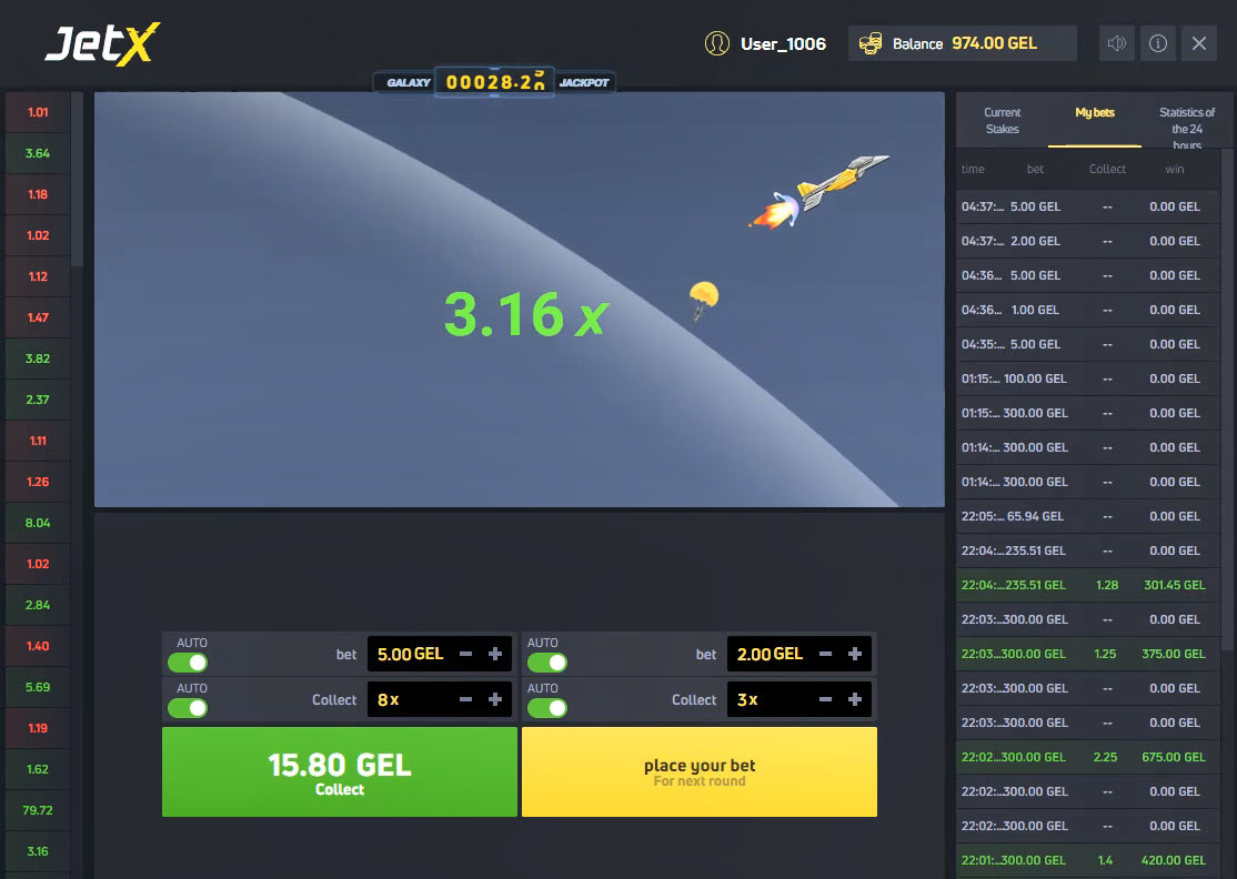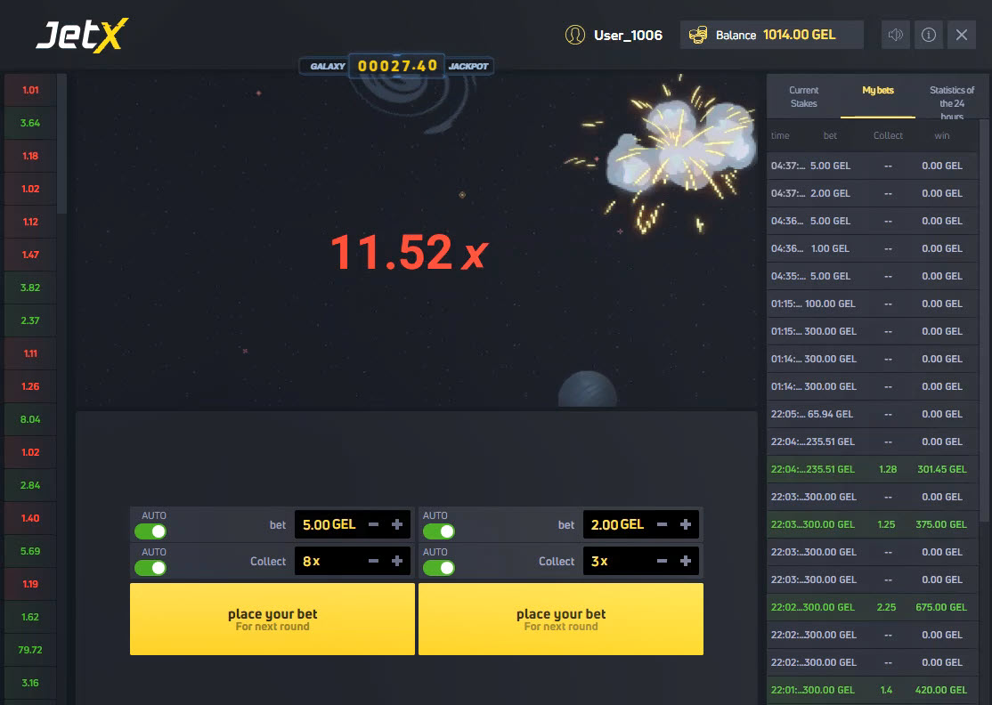 Ei sillä, että sillä olisi ollut väliä, mutta avaruusalus jatkaa nousuaan, kunnes se räjähtää, mikä tässä tapauksessa tapahtui kertoimella 11,52x. Huomaa myös saldoni, 1014 GEL. Muistutuksena, kahden panoksen tekemisen jälkeen saldoni oli 968. Vasemman puolen panos palautti 5 × 8 = 40. Oikean puolen panos palautti 2 × 3 = 6. Kokonaisvoittoni oli 40 + 6 = 46. Uusi saldoni on siis 968 + 46 = 1014.