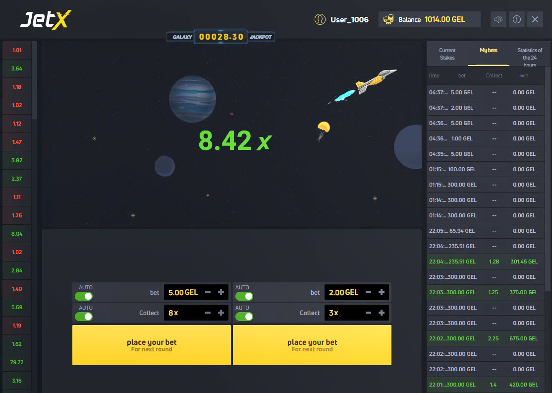 Kun testasin tätä peliä tätä artikkelia varten, eräässä pelissä avaruusalus saavutti kertoimen 12540,26. Tarkista pelin historia alla olevan kuvan vasemmalta puolelta.