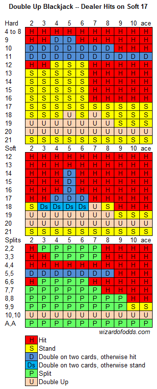 Double Up Blackjackin säännöt ovat kokeneet joitakin muutoksia, mutta uskoakseni alla oleva kuvaus vastaa sitä, miten sitä pelataan tällä hetkellä Isossa-Britanniassa (päivitetty 24. syyskuuta 2017). Tällä hetkellä jakaja saa pehmeän 17:n, kun aiemmin se seisoi. Älkää väittäkö, että blackjackit maksavat voittoja 3:1 tämän lähteen perusteella, jonka väitän vahvasti olevan virheellinen.