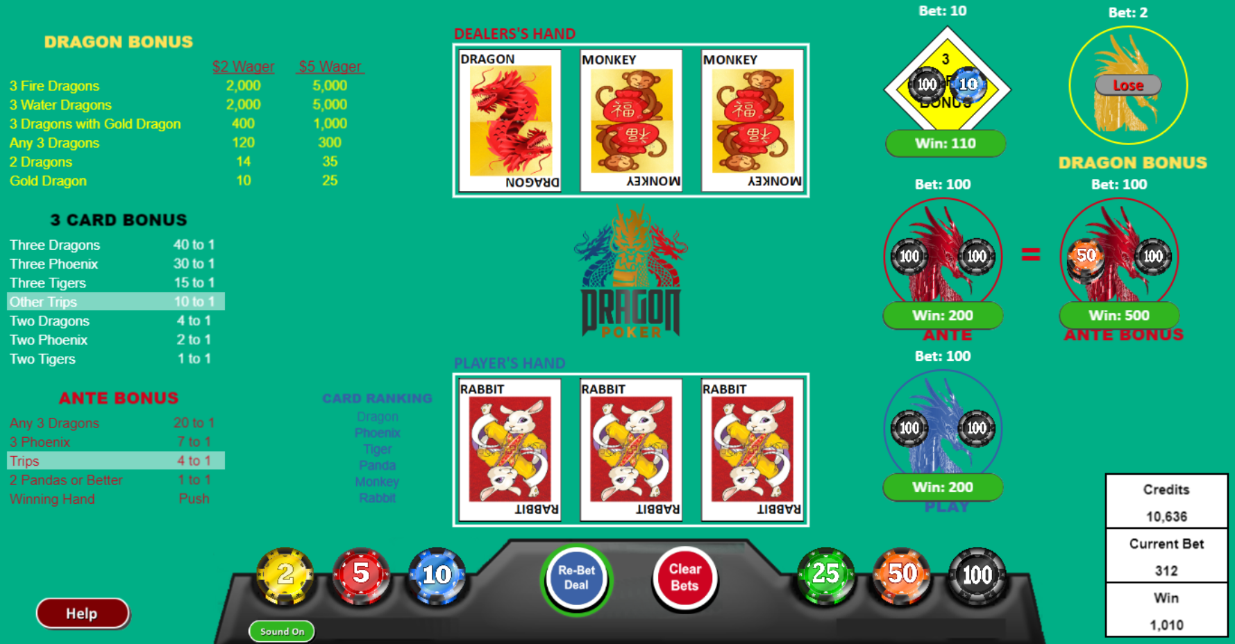 Yllä olevassa esimerkissä kolme jänistäni voittivat jakajan apinaparin. Peli ilmaisee kuvan "voiton" palautettuna summana, mukaan lukien alkuperäinen panos. Panostin 100 dollaria kukin Ante-, Ante Bonus- ja Play-panoksille. Ante ja Play voittivat kukin toiset 100 dollaria. Ante Bonus -panos maksoi takaisin kertoimella 4:1, jolloin voittoja oli 400 dollaria. 10 dollarin panokseni 3 Card Bonus -panokselle maksoi kertoimella 10:1 pienelle kolmoselle eli 100 dollarille. Lohikäärmebonus hävisi, koska minulla ei ollut lohikäärmeitä.