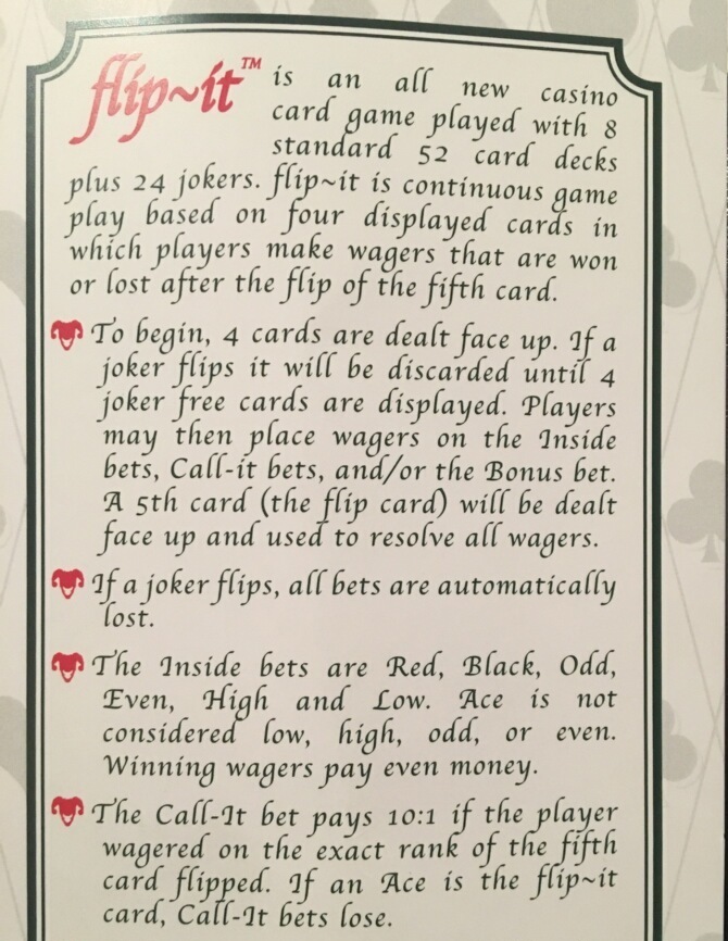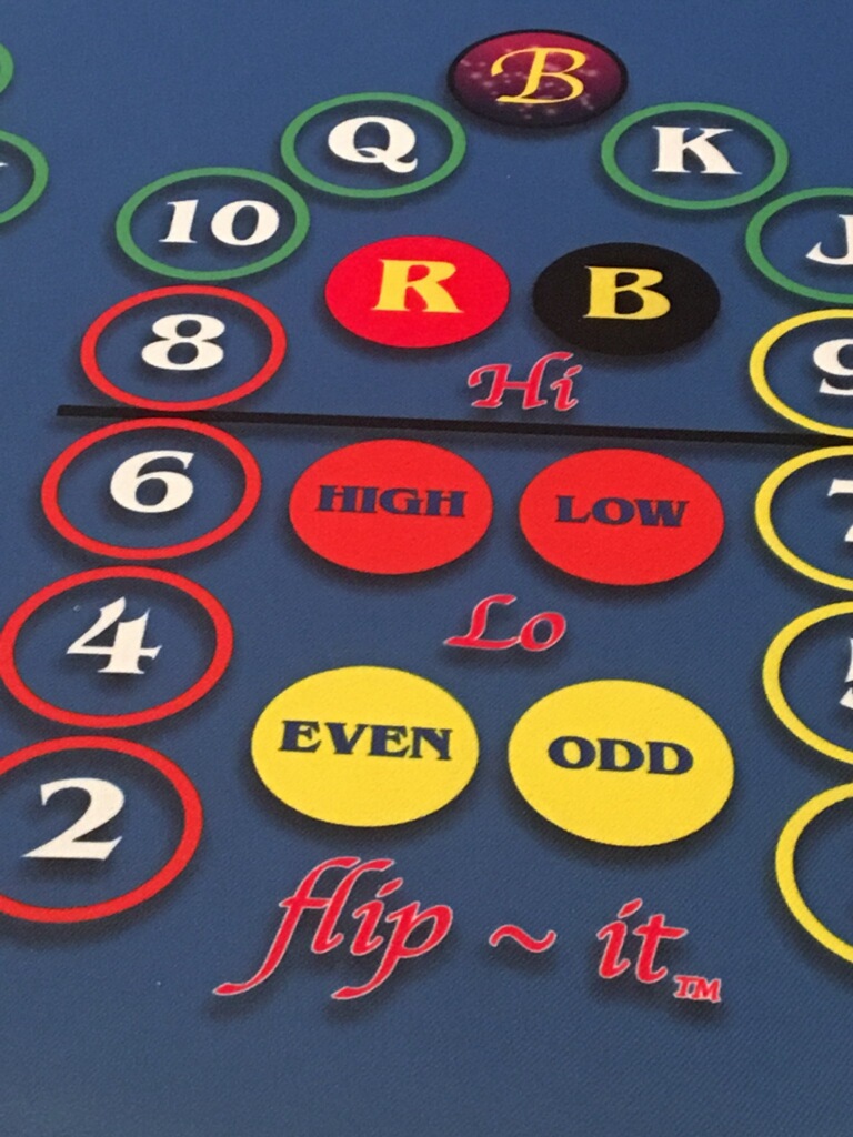 Flip-It on uusi pöytäpeli, jota kokeiltiin Las Vegasin Riossa toukokuun lopulla 2018. Sitä ei pidä sekoittaa kolikkopeliin, jossa kolikkoja heitetään ja heitetään, josta kerron Flip It -sivullani (ilman yhdysviivaa). Pelin verkkosivuston mukaan pelin nimessä käytetään tilde-symbolia, mutta kyltissä ja sääntökortissa käytetään yhdysviivaa. Käytän yhdysviivaa, mutta myönnän epäselvyyden.