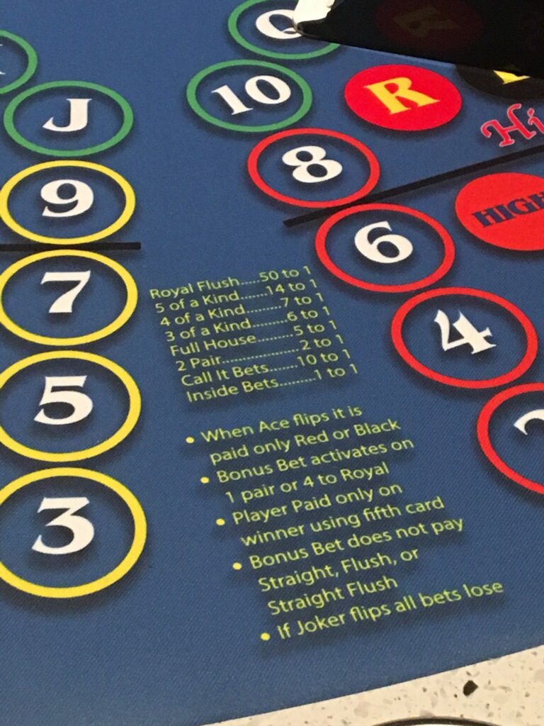 *: Ennen 20. syyskuuta 2018 ässä aiheutti häviämisen pienimmissä, suurissa, parittomissa ja parillisissa panoksissa. Tuona päivänä ässä muutettiin tasapeliksi näissä panoksissa.