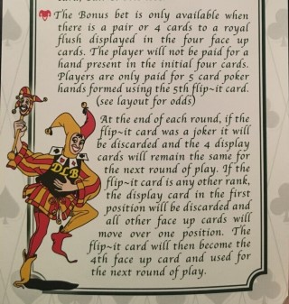 - Pelaaja voi asettaa bonuspanoksen, jos neljällä ensimmäisellä kortilla on mahdollisuus muodostaa maksava viiden kortin käsi yhdessä viidennen kortin kanssa. Jos bonuspanosta ei voida voittaa, sitä ei voida asettaa.