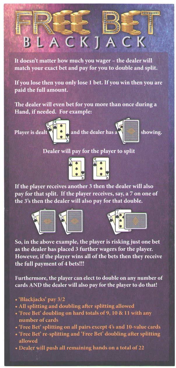 Free Bet Blackjack on pelin keksijän Geoff Hallin kehittämä blackjack-muunnos. Tämän pelin juju on se, että pelaajan ei tarvitse vaarantaa omia rahojaan jakaessaan tai tuplatessaan (useimmiten). Se on kuin pelaisi pöydässä anteliaan poikaystävän kanssa, joka tekee kaikki lisäpanokset puolestasi ja antaa sinun pitää voitot. Mikä on juju? Kuten Geoffin toisessa pelissä, Blackjack Switchissä, jos jakaja saa 22, kaikki jäljellä olevat panokset menevät eteenpäin.