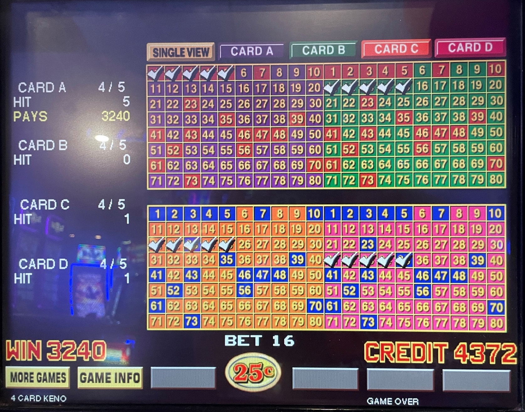 Seuraavaksi tarkastellaan tarkemmin tapausta, jossa pelaaja valitsee kuusi numeroa, joista kolme on yhteisiä kaikilla korteilla ja loput kolme ovat yksilöllisiä jokaisella kortilla. Esimerkiksi neljän kortin pelissä voisin valita: