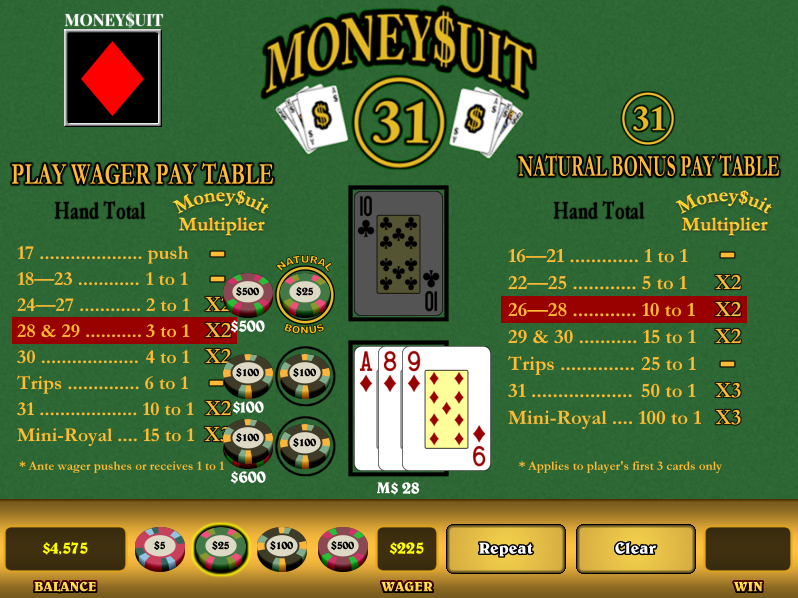 Money$uit 31 on uusi pöytäpeli, joka julkaistiin Lac Vieux Desert Resort & Casinolla Watersmeetissä, Michiganissa tammikuussa 2015. Sitä on vaikea verrata mihinkään olemassa oleviin peleihin, koska pelin tarkoituksena on yhdistää useiden samaa maata olevien korttien pistearvot, jotta saadaan yhteensä 17 pistettä tai enemmän. Siinä on blackjackin korttien arvot ja monissa pokeripohjaisissa peleissä käytetty korotus/kippaus-päätös. Mailla on merkitystä, ja erityinen Money$uit määräytyy kahden mukautetun nopan heiton perusteella.