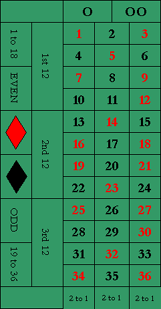 Aivan kuten nolla ja tuplanolla, kaikki tasarahapanokset häviävät, jos kuula pysähtyy vihreään. Numeroiden 1–36 järjestys on sama kuin yhden nollan ruletissa. Numerot 0, 00 ja logo ovat kaikki peräkkäin, logon ollessa keskellä.