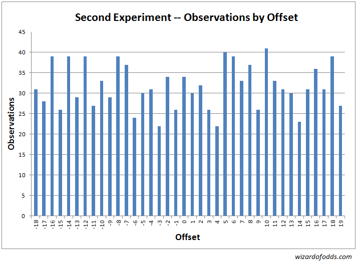 Ensimmäisen ja toisen kokeen tulosten välinen korrelaatiokerroin on 0,153853. Yksinkertaisesti sanottuna se tarkoittaa, että lievä korrelaatio oli olemassa, mutta selvästi sen rajoissa, mitä voitaisiin odottaa kahdelta satunnaiselta datajoukolta.