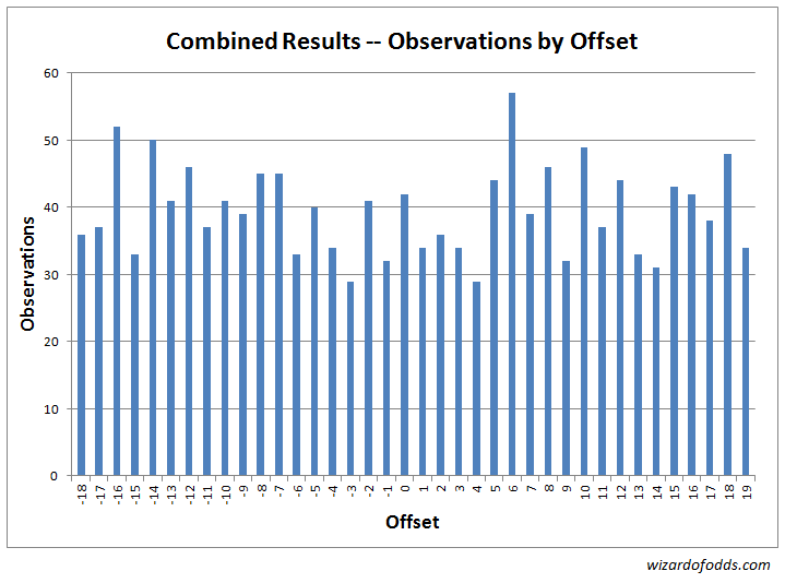 Khiin neliöön perustuva sopivuustesti antaa khiin neliö -tilastoksi 45,29 ja vapausasteiksi 37. Todennäköisyys, että satunnainen peli tuottaisi tätä vinompia tuloksia, on 16,5 %.