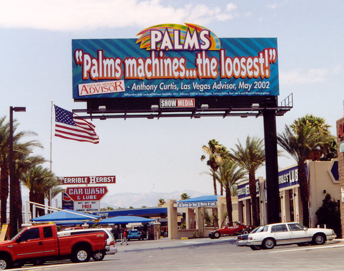 Yllä oleva kyltti löytyy kadun toiselta puolelta Palmsia. Vaikka tein tutkimuksen itse, Anthony Curtis julkaisi sen LasVegas Advisorissa , josta se tuli tunnetuksi. Kyltin "..." sisältää melko paljon tietoa, joka on kätevästi jätetty pois kyltistä. Itse asiassa tutkimuksessa sanotaan vain, että Palmsilla oli Las Vegasissa tutkituista kasinoista vähiten nikkeliä tuottavat videopelikoneet. Pienellä präntätty teksti alareunassa sanoo: "Riippumaton tutkimus, joka tehtiin marraskuun 2001 ja helmikuun 2002 välisenä aikana Austin Powers-, Fortune Cookie-, Reel'em In- ja Wheel of Fortune -peleistä. He jättivät LeopardSpotsin pois, ja tutkimus alkoi lokakuussa."