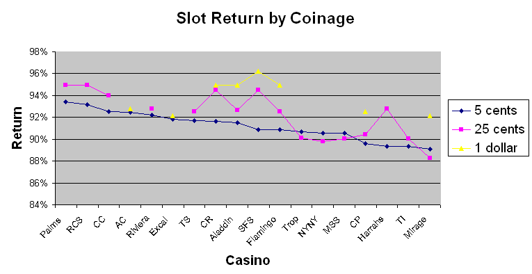 Seuraava kaavio näyttää kunkin kolikon tuoton kullakin kasinolla. Tämä kaavio näyttää tukevan yleistä korrelaatiota nikkelin ja neljänneskolikon tuoton välillä, vaikka se ei olekaan vahva korrelaatio. Neljänneskolikon ja dollarin välillä on myös karkea korrelaatio, poikkeuksina Arizona Charlie's ja Excalibur.