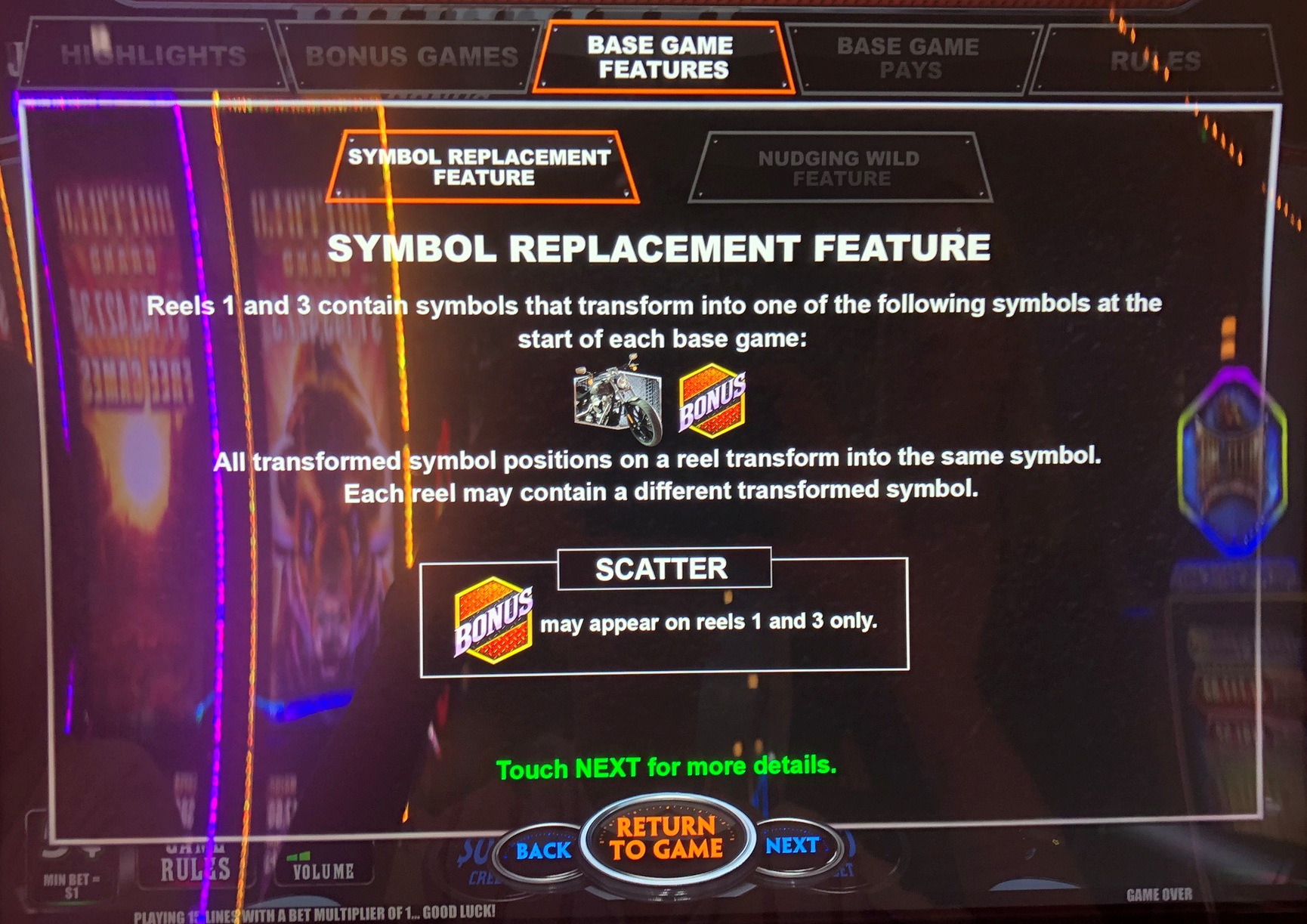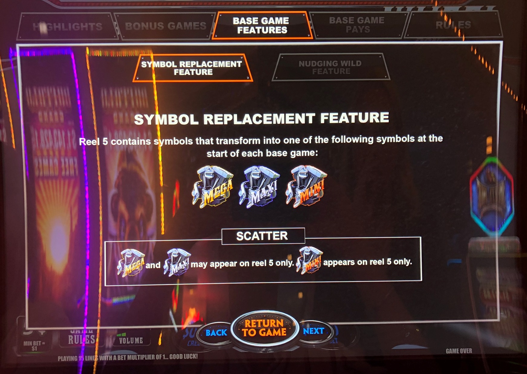 Scatter-symbolit ovat rullilla 1 ja 3. Rullalla 5 on bonussymboleita. Pelissä on "symbolin korvaus" -ominaisuus, jossa erikoissymbolit, nimittäin wild-, scatter- ja bonussymbolit, korvaavat satunnaisesti muut voittolinjasymbolit. Mitä enemmän pelaaja panostaa, sitä enemmän scatter- ja bonussymboleita ilmestyy.