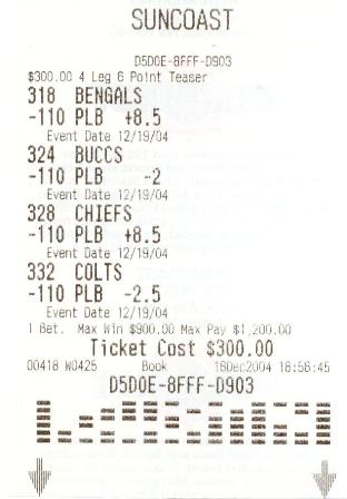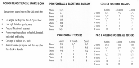 Valitettavasti liberaalit kertoimet -110 kahden osaottelun, +180 kolmen osaottelun ja +300 neljän osaottelun kuuden pisteen NFL-teaserille näyttävät tehneen virheen kaudella 2014. Viimeisin vastustajana toiminut Jerry's Nugget laski heidän kertoimiaan kaudella 2014.