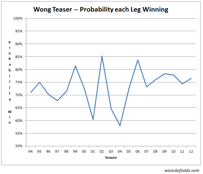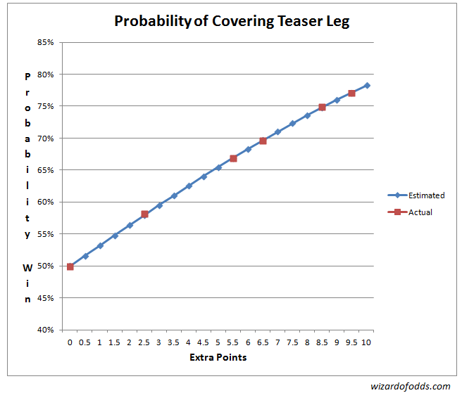 Tämän sivun analyysi perustuu 4450 NFL-otteluun kausien 1994 ja 2012 välillä. Aloitin vuodesta 1994, koska silloin otettiin käyttöön kahden pisteen muunnossääntö. Otoskoon vaihtelun lisäksi minun piti myös tehdä oletuksia siitä, miten pistehajonnat muodostuivat teaser-korteissa. Ajan säästämiseksi analysoin viittä tyyppiä kaikkien 12 tunnetun parlay-korttityypin sijaan. Ymmärtääkseni, miten lisäpisteet vaikuttavat voittotodennäköisyyteen, loin Wizard Teaser -yhtälön .