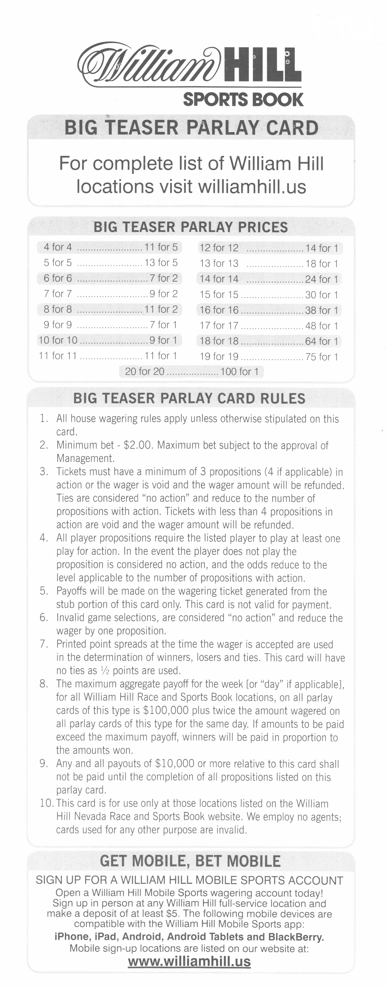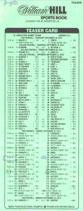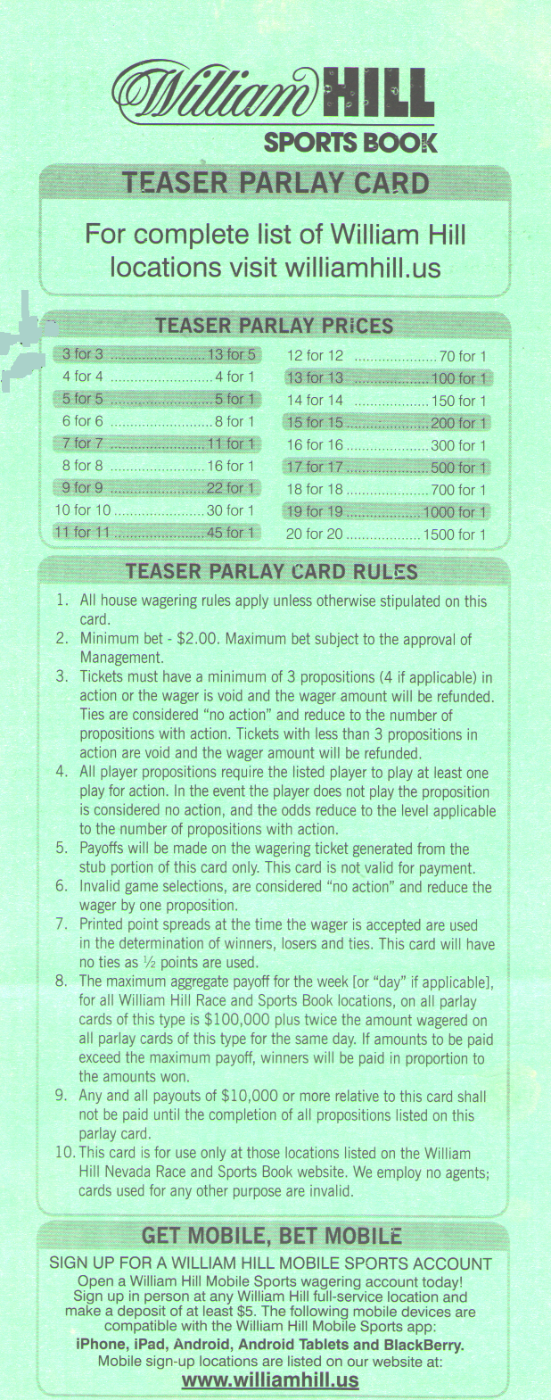 Vain William Hill tarjoaa 10 pisteen teaserin. Wizard Teaser -yhtälön mukaan satunnaisesti valinnut pelaaja voi odottaa voittavansa 78,25 % valinnoista. Seuraava taulukko näyttää satunnaisesti valinneen pelaajan voittotodennäköisyyden ja odotetun tuoton William Hillin kertoimiin verrattuna. Talon etu vaihtelee 18 prosentista 29 prosenttiin.