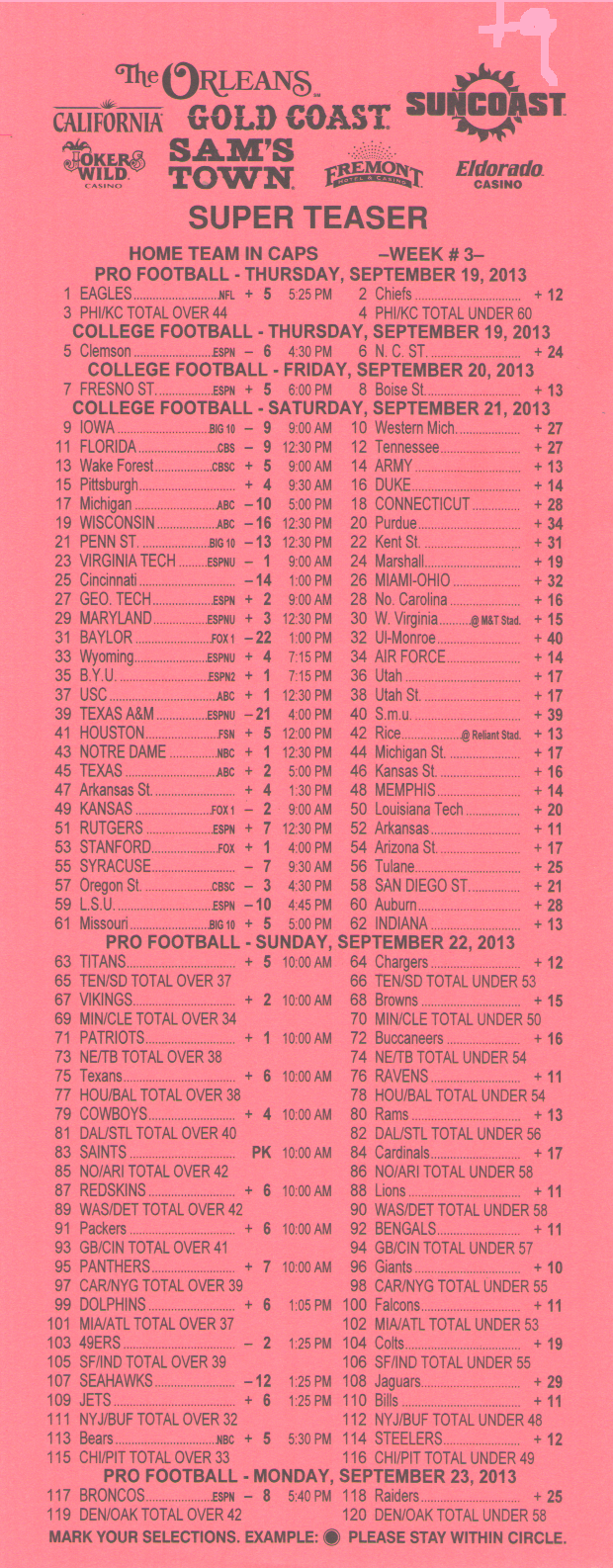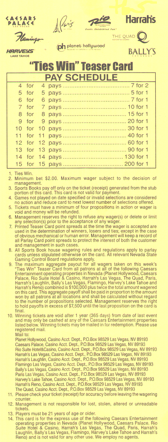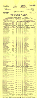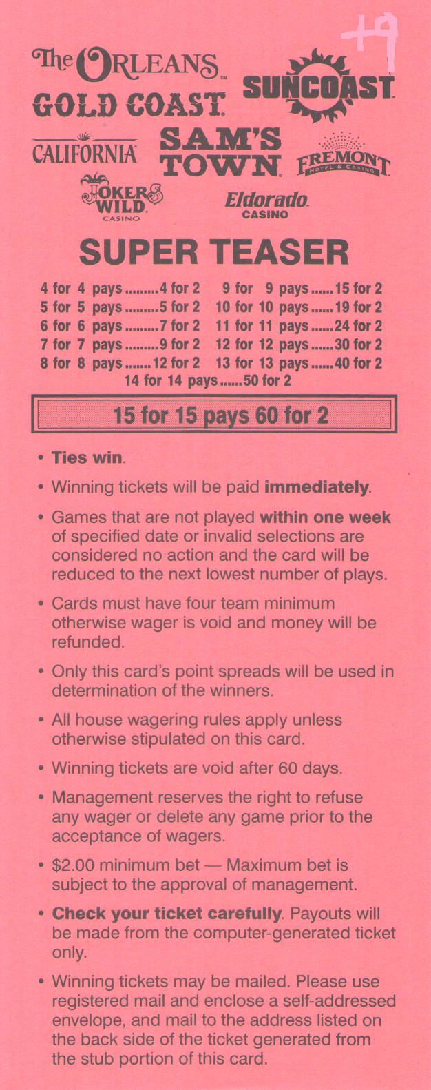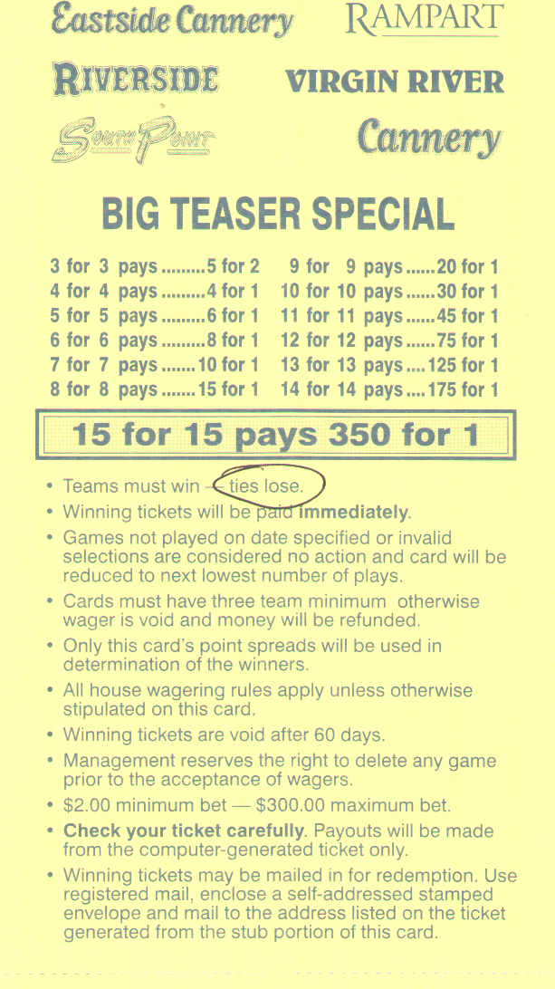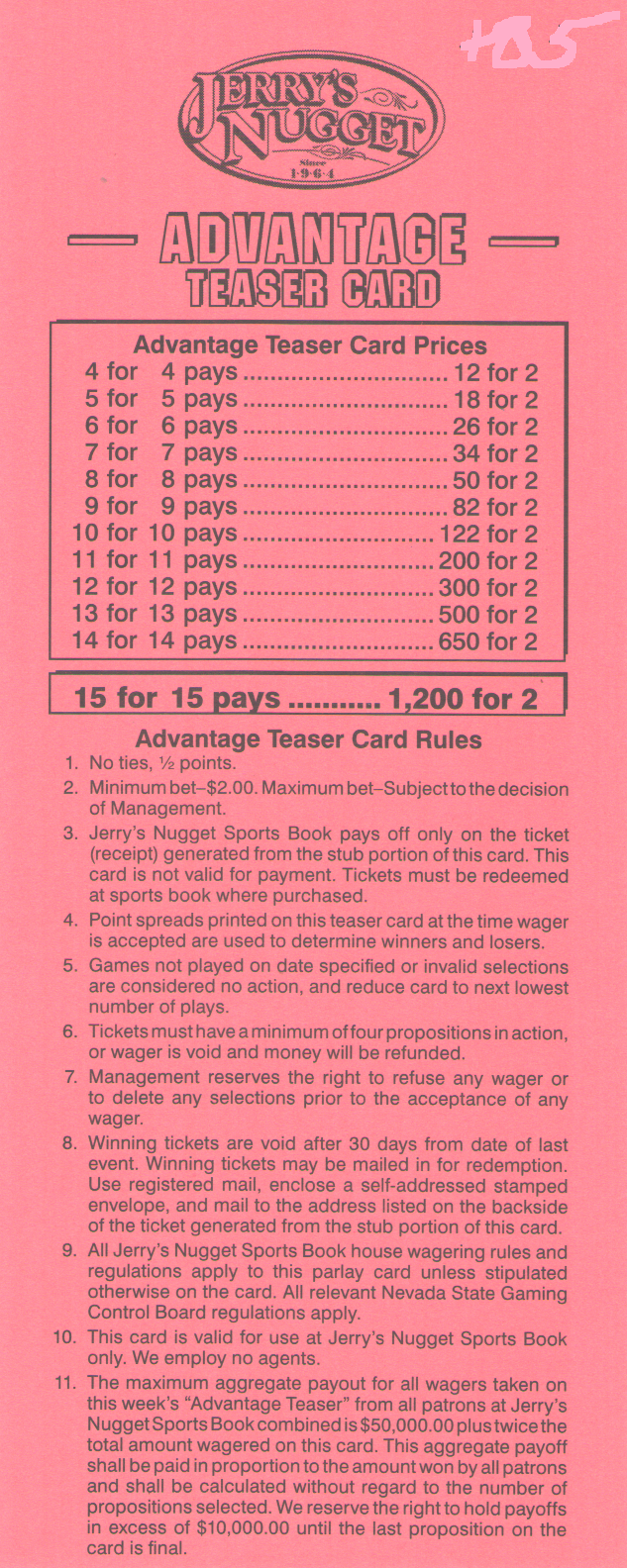 Valitettavasti liberaalit kertoimet -110 kahden osaottelun, +180 kolmen osaottelun ja +300 neljän osaottelun kuuden pisteen NFL-teaserille näyttävät tehneen virheen kaudella 2014. Viimeisin vastustajana toiminut Jerry's Nugget laski heidän kertoimiaan kaudella 2014.