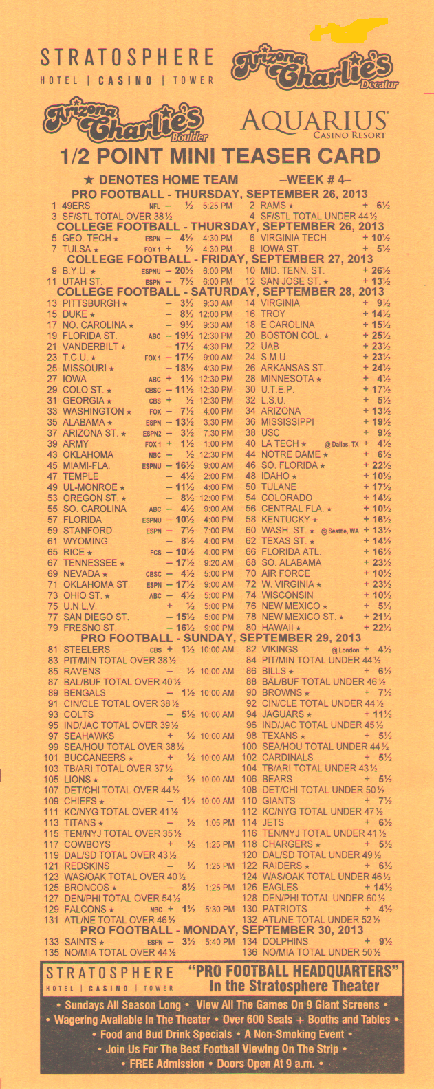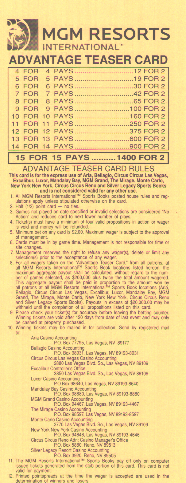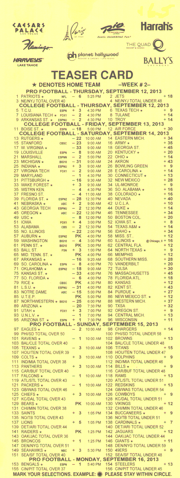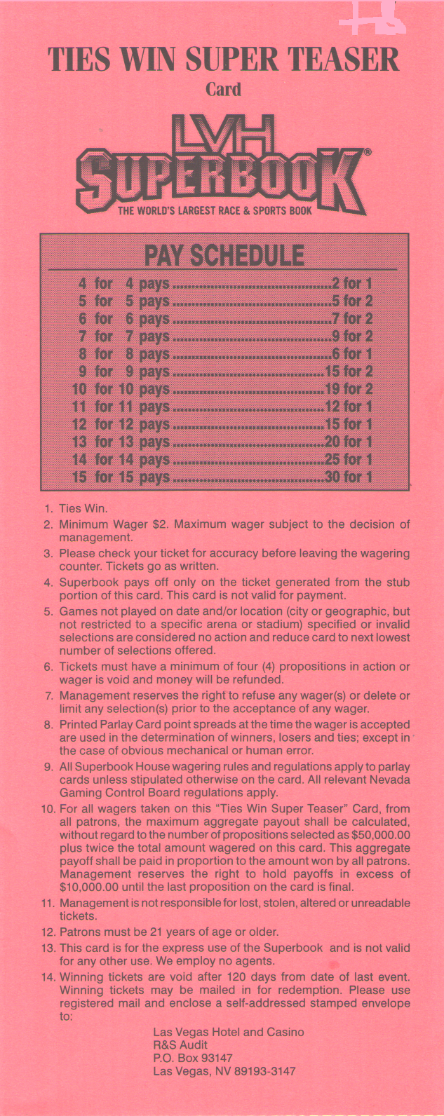 Valitettavasti liberaalit kertoimet -110 kahden osaottelun, +180 kolmen osaottelun ja +300 neljän osaottelun kuuden pisteen NFL-teaserille näyttävät tehneen virheen kaudella 2014. Viimeisin vastustajana toiminut Jerry's Nugget laski heidän kertoimiaan kaudella 2014.