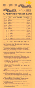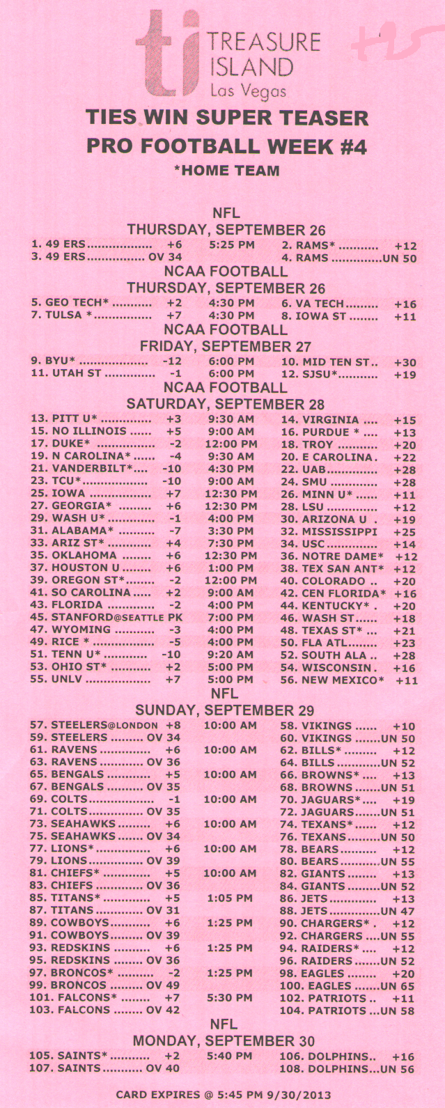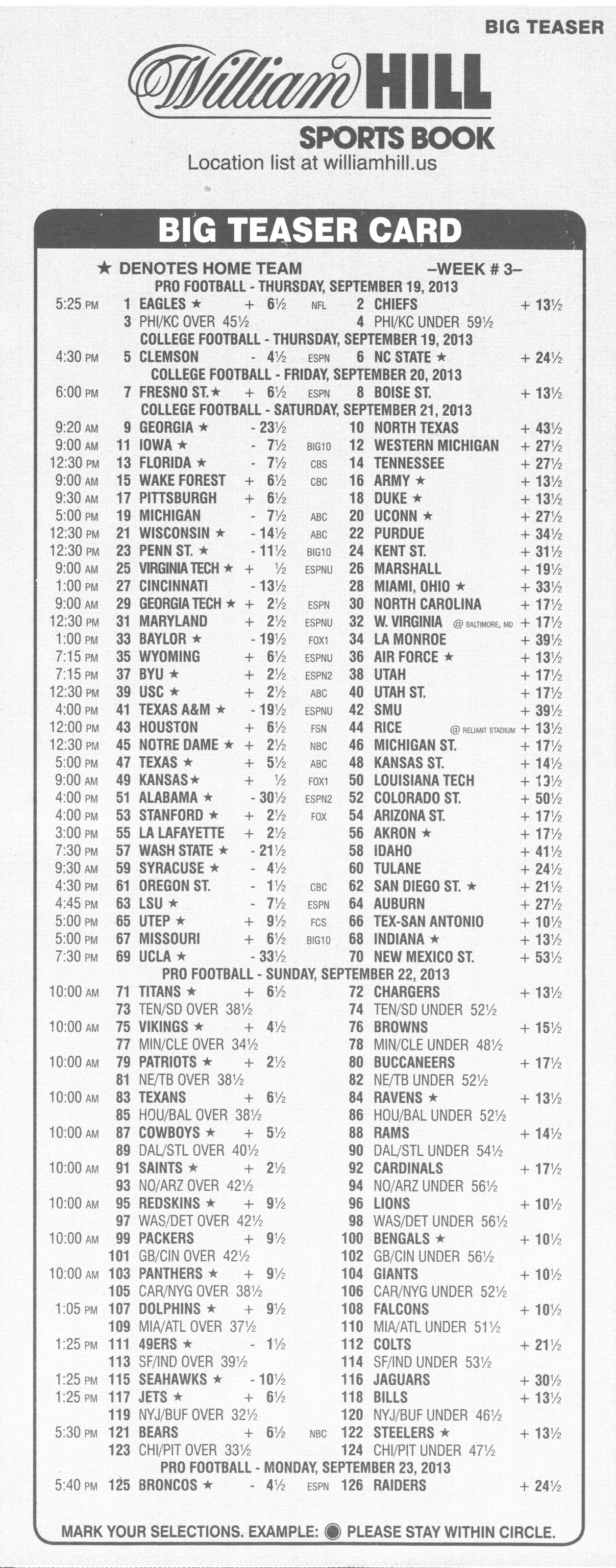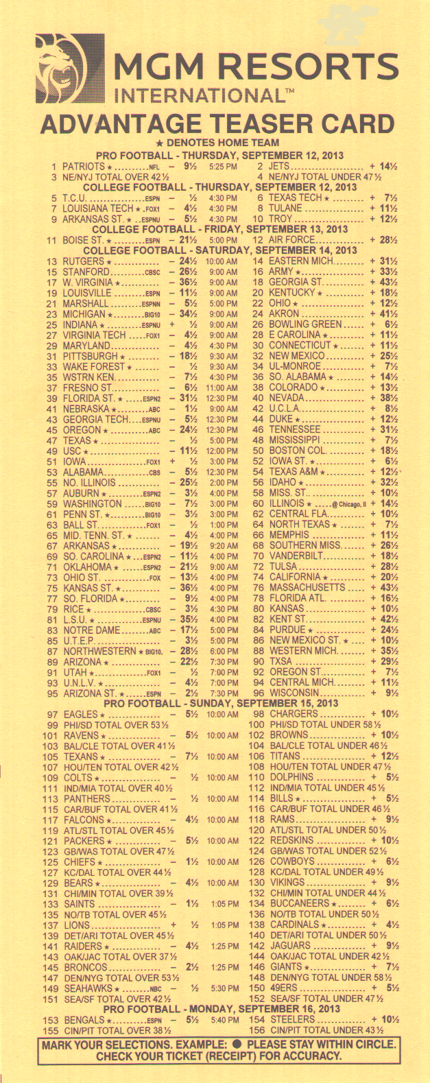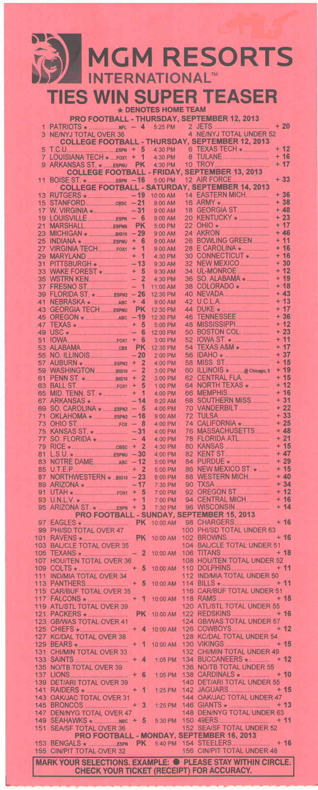 Valitettavasti liberaalit kertoimet -110 kahden osaottelun, +180 kolmen osaottelun ja +300 neljän osaottelun kuuden pisteen NFL-teaserille näyttävät tehneen virheen kaudella 2014. Viimeisin vastustajana toiminut Jerry's Nugget laski heidän kertoimiaan kaudella 2014.