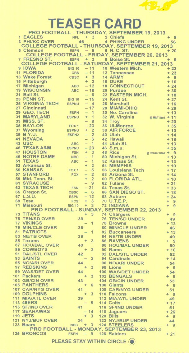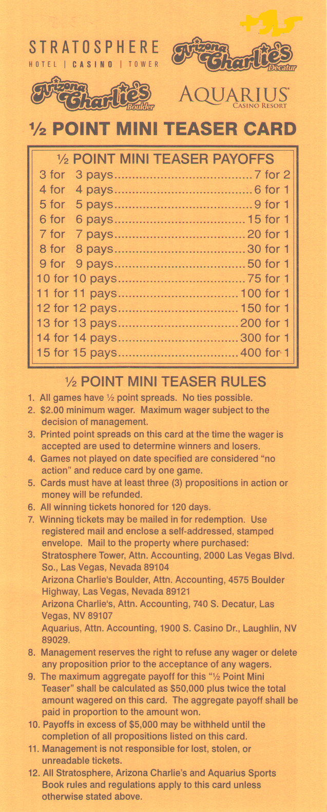 Vedonlyöjä voi valita 6, 6,5 tai 7 lisäpistettä teaser-vedon jokaisesta osuudesta. Luonnollisesti mitä enemmän pisteitä vedonlyöjä saa, sitä vähemmän hänellä on mahdollisuuksia voittaa. Voittokertoimet vaihtelevat paikasta toiseen, joten katso voittotaulukoistani, kuka maksaa parhaat kertoimet. Laiskoille lukijoille tiedoksi kuitenkin, että Jerry's Nuggetilla on parhaat OTB-teaser-kertoimet useimmille osuuksien ja pisteiden määrälle.