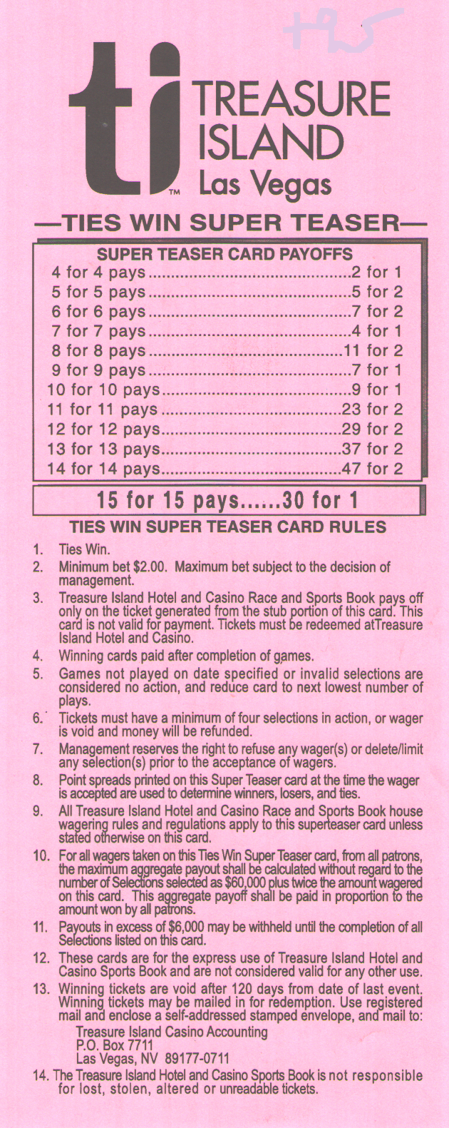 Kaksi vedonlyöntitoimistoa tarjoaa 9,5 pisteen teaser-vetoja, Treasure Island ja Westgate. Niiden voittotaulukot ovat seuraavat. Kuten näet, Treasure Island tarjoaa jatkuvasti paremmat kertoimet.
