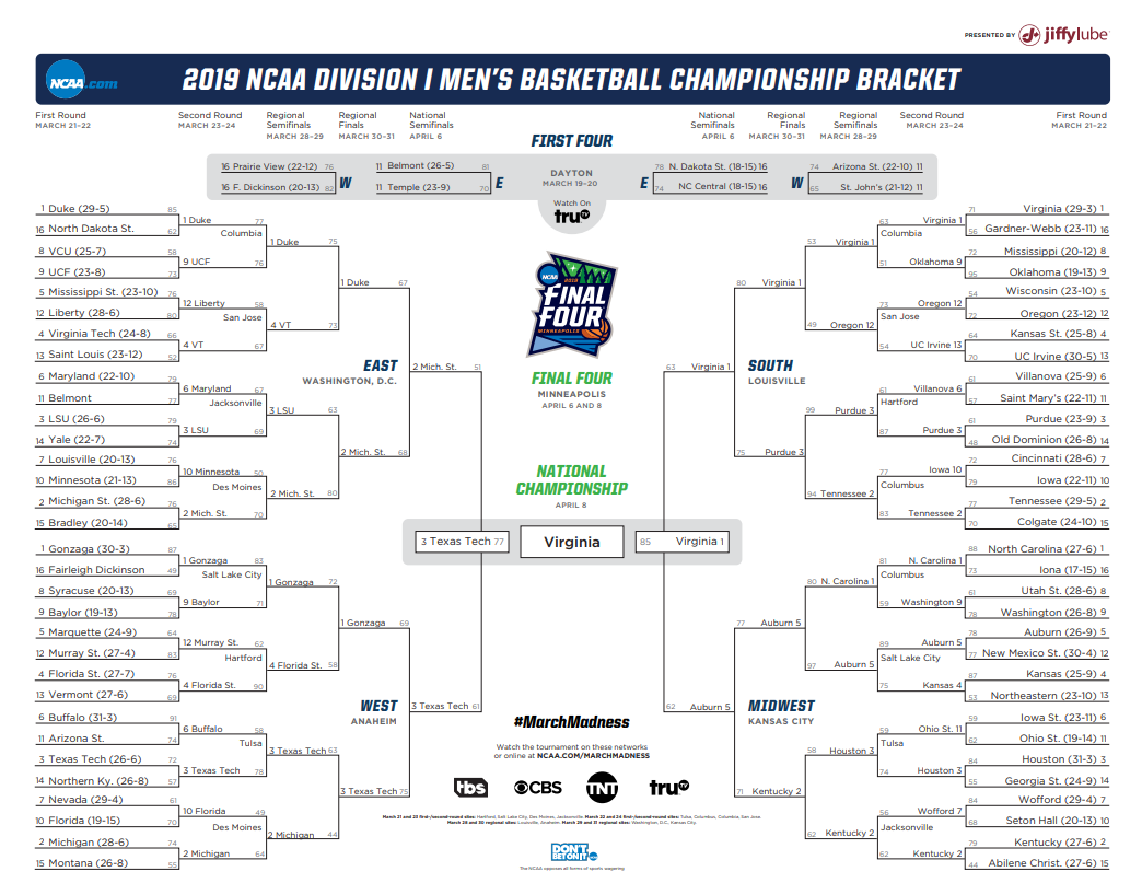 Turnaus on useimmiten yksipudotuspeli, jossa aloitetaan 64 joukkueella. Täydellisyyttä tavoittelevien lukijoideni tyydyttämiseksi turnauksessa on itse asiassa 68 joukkuetta, joista kahdeksan kohtaa neljässä ottelussa. Näiden neljän ottelun voittajat ja 60 muuta joukkuetta muodostavat yhteensä 64 joukkuetta, ja silloin pudotuspelikaavioiden valinta yleensä alkaa.