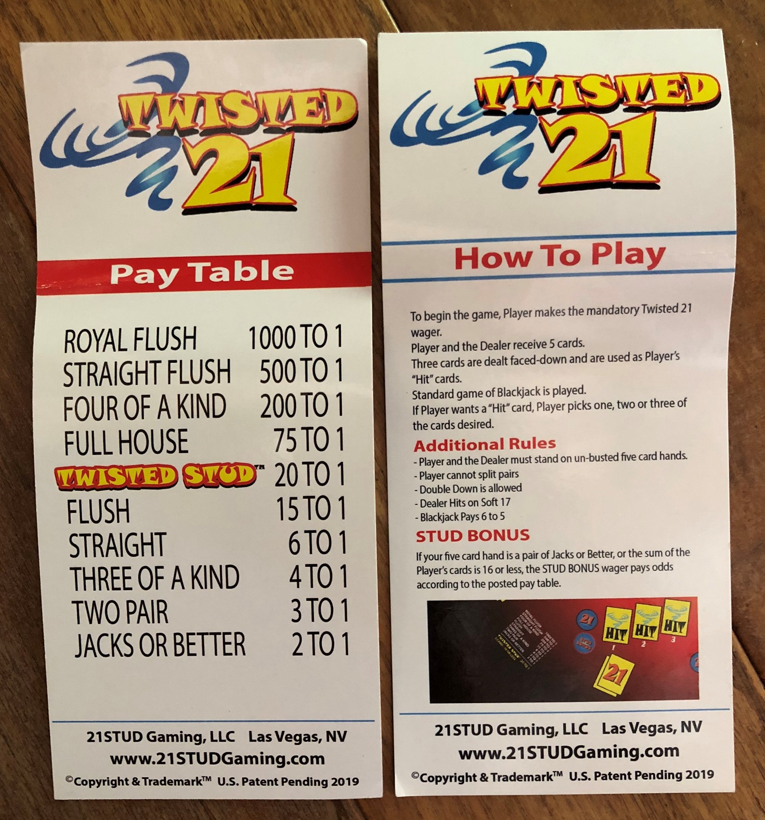 Twisted 21 on blackjack-muunnelma, jonka kokeilu alkoi Las Vegasin Riossa 7. heinäkuuta 2019. Lyhyesti sanottuna jokaisella pelaajalla on aluksi kaksi ja kolme kuvapuoli alaspäin olevaa korttia. Jos pelaaja haluaa ottaa tai tuplata, hän valitsee käteensä lisäämänsä kortin. Saatavilla on myös pokeripohjainen sivupanos, joka perustuu kaikkien viiden kortin pokeriarvoon.