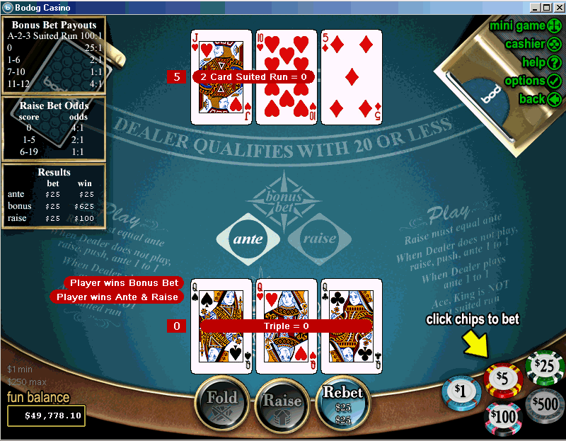 Seuraavassa kuvassa panostin 25 dollaria sekä ante- että bonuspanokselle. Sitten panostin 25 dollaria korotuspanokselle. Kolmosella tulokseni oli 0. Jakajan samaa maata oleva kymppi on 0 pisteen arvoinen ja singleton 5 on 5 pisteen arvoinen, joten yhteensä saan 5. Nollani voittaa jakajan 5, joten voitin 1:1 eli 25 dollaria antella, 4:1 eli 100 dollaria korotuksella ja 25:1 eli 625 dollaria bonuspanoksella, joten voitin yhteensä 750 dollaria.
