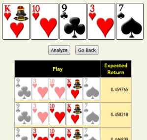 Ilmainen videopokerianalysaattorini laskee parhaan tavan pelata mitä tahansa kättä ja mitä tahansa maksutaulukkoa useimmissa videopokeripeleissä.