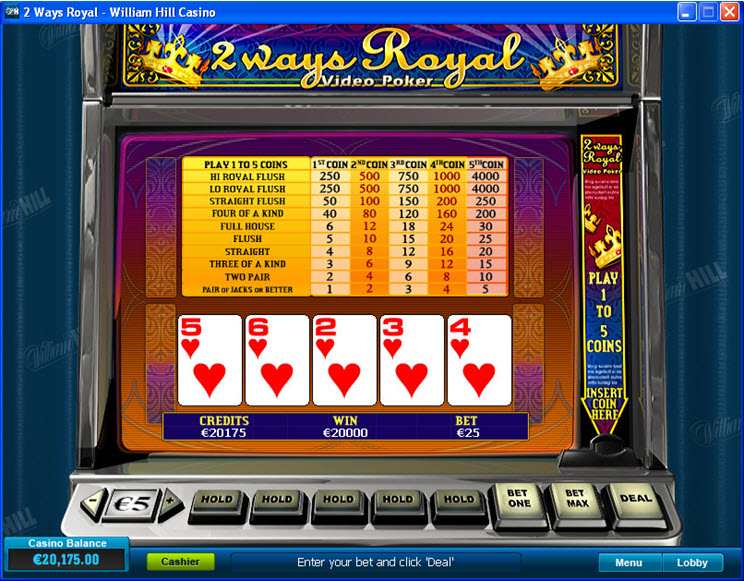 2 Ways Royal/Split Way Royal on videopokeripeli, jota löytyy joiltakin Playtechin ja Betsoftin nettikasinoilta. Pelin ydin on se, että 2-6-värisuora maksaa saman verran kuin kuningasvärisuora, 800-kertaisesti, maksimipanokseen perustuen.