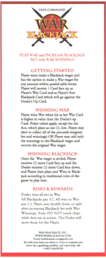 Näin War Blackjackin ensimmäisen kerran Downtown Grandissa Las Vegasissa 9. toukokuuta 2014. Minulle kerrottiin, että sitä oli pelattu jo silloin Carson City Nuggetissa ja Eurekassa Mesquitessa. Peli on yhdistelmä Waria ja Blackjackia. Juttu on siinä, että jos pelaaja voittaa War-panoksen, hän voi parantaa voittoaan blackjack-panoksellaan tietäen jo ensimmäisen korttinsa ja jakajan näkyvän kortin.